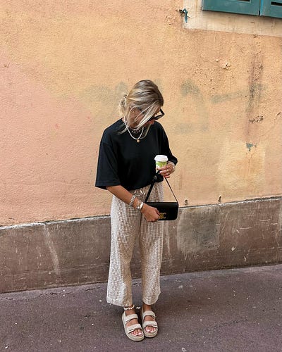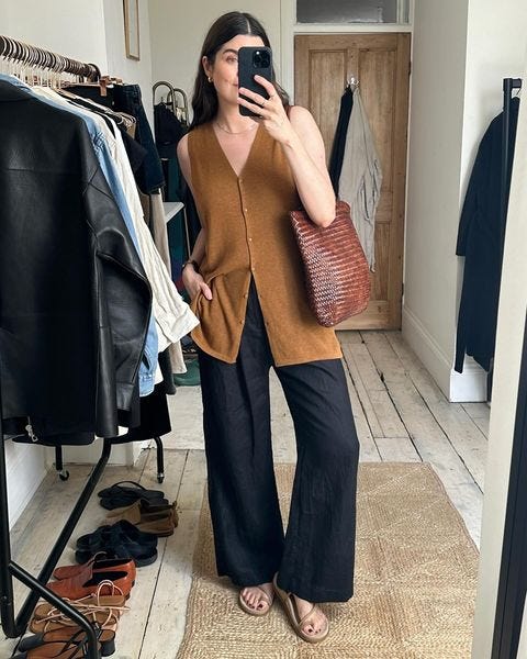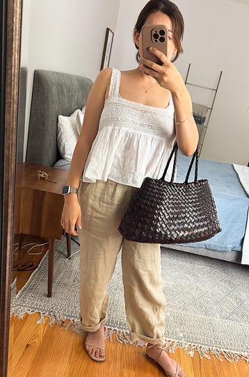 You’re currently a free subscriber to Downtime. Consider becoming a paid supporter to get extra content, access to the full archives, and all my secrets (kidding…kinda). Subscriptions are what allow me to prioritize and write this. No pressure either way—thanks for reading! So I had a mini meltdown over linen pantsContinuing my postpartum personal style journey with a styling fail and a big shopping mistakeDowntime Edit is a new column exploring personal style post-pandemic (and postpartum, for me) and featuring the best shopping finds. (To opt out of this column, you can edit your email settings here.)Today’s post was originally supposed to be about how to dress yourself in really hot weather without wearing shorts, a topic that recently won a poll on my Instagram. My plan was to show you how I’d style a simple article of clothing that I own: linen pants. However, things did not go according to plan. I’m not one to bury the lede, so I’ll just tell you: my outfits were a disaster. Instead of throwing away the story idea altogether, I thought it would be helpful to share my shopping learnings from this saga. Learn from my mistakes!! In particular, there is one piece of style advice that’s shared repeatedly on social media: “It’s not about the item; it’s all about how you style it.” (Or some variation thereof.) From my experience, though—and this particular one proves my theory—there are just certain lengths, shapes, cuts, and colors that will not work for you. As a petite woman, I know this very well. A big part of rediscovering my personal style postpartum has been to nail the right silhouette for my body. I can’t simply “throw on a belt and the right shoe” and magically feel great about my outfit. Sometimes, the details of the thing are all wrong. This is why I’ve been so stubborn in my pursuit of the right “building block” pieces in my closet lately, like the perfect white tee, the perfect pair of jeans, and so on (which I owe you an update on). It can’t be just any tee—it has to have the right sleeve, collar, length, and shape for me. I’m curious about what you think about this popular piece of styling advice in the comments. Anyway, here’s how my styling saga unfolded, the pieces I ended up adding to my wishlist as a result, and some other big shopping and styling takeaways. My first step was choosing an item to styleAs mentioned, I chose linen pants. I only own one pair of linen pants: these from Quince. They were so accessible in price that it was a bit of a throwaway purchase right before we left for Italy two summers ago. I didn’t put much thought into how I’d style them (my first shopping mistake), so they never actually got worn and have mostly sat in my closet for the past two years. The weather report read 88 degrees, I didn’t want to wear shorts or jeans, and I love a good challenge, so I thought—why not? Next, I gathered a bit of style inspirationWhen looking for outfit inspiration, I do two main things: