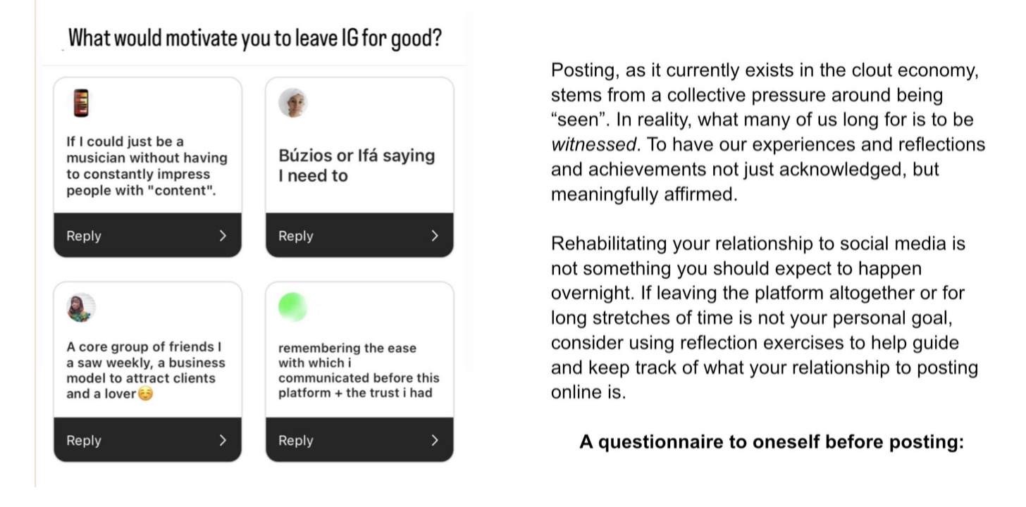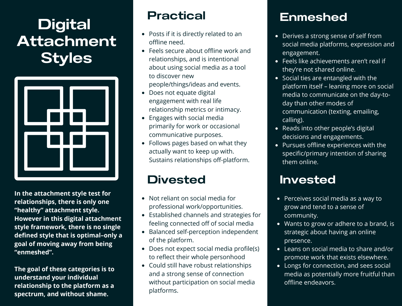The Data Healing Workbook: Introducing: 'Digital Attachment Styles'This journal is for anyone who suffers from FOPO (the Fear of Posting Online). 27-page document + free Digital Attachment Styles pamphlet below.Introduction This workbook is for anyone who suffers from FOPO (the Fear of Posting Online). I am someone who came of age online, and who has seen some of the best and worst parts of the internet as a result. A lot of us know that social media is making us spiral, become more self-conscious and more judgemental. It’s become commonplace for people to take extended social media breaks, but the platforms are designed to have us coming back for more: more validation, more visibility, more connection, more opportunity, more engagement – and, most recently, more devastation. What happens if we think about our relationship to social media as just that: a relationship. As with any relationship, it has its highs and lows and is fundamentally built off of attachments. The majority of us use social media day-to-day, and over time have developed a relationship to unwritten social contracts. Selfies are out, photo dumps are in. Posing is out, blurry is in. The rules are always changing. But who’s writing them, really? This time last year, I started working on the Data Healing Journal. After years of spiraling on and about Instagram, I managed to land institutional support from Stanford’s Digital Civil Society Lab to put it all together. If you know me, you know how I feel about academia. I dropped out of Yale 7 years ago – largely because of data trauma – and my work since leaving college has revolved around grassroots spaces (which, to me, Instagram is part of – for better or for worse). The journal was more or less finished by September, but just as I was gearing up to put it out in the world, the genocide in Gaza began and I put the project to the backburner out of necessity. Everything I thought about how leaving Instagram was essential for our liberation was challenged to its core, as people on the ground facing terror – from Gaza to Tigray – pleaded with the world to share about what was happening to them. My conceptualization of Data Healing continues to evolve, and so will this document. The internet is always changing, but there are some things that stay the same: our longings for connection, our fears of being misunderstood, our frustrations at not being heard. I wrote this journal to try and honor the duality of it all; but most of all, I wrote it to try and look shame in the face, and ask that shame where it’s really coming from. Governments strategically cut off social media when they are planning to intensify their terror. This is what happened in Tigray, in Gaza, Sudan, West Papua, New Caledonia. And this is precisely what happened in my own home country, Kenya, these past few days in response to the paradigm-shifting Anti-Finance Bill Protests. Twitter was shut down. Internet became sporadic. And the government had the audacity to blame it on undersea cables. Today, I woke up to emails from my Stanford cohort about our fellowship’s final presentation showcase. I’ve been so deep in other organizing work that I had completely forgotten it was this morning. I hadn’t revisited the journal in months but when I opened it back up to get ready to share, I was surprised by how much I myself needed to do the exercises in it. Categories: Evaluation, Compassion, Reflection, Inspiration, Goal-Setting and Strategy This workbook is designed to help you: