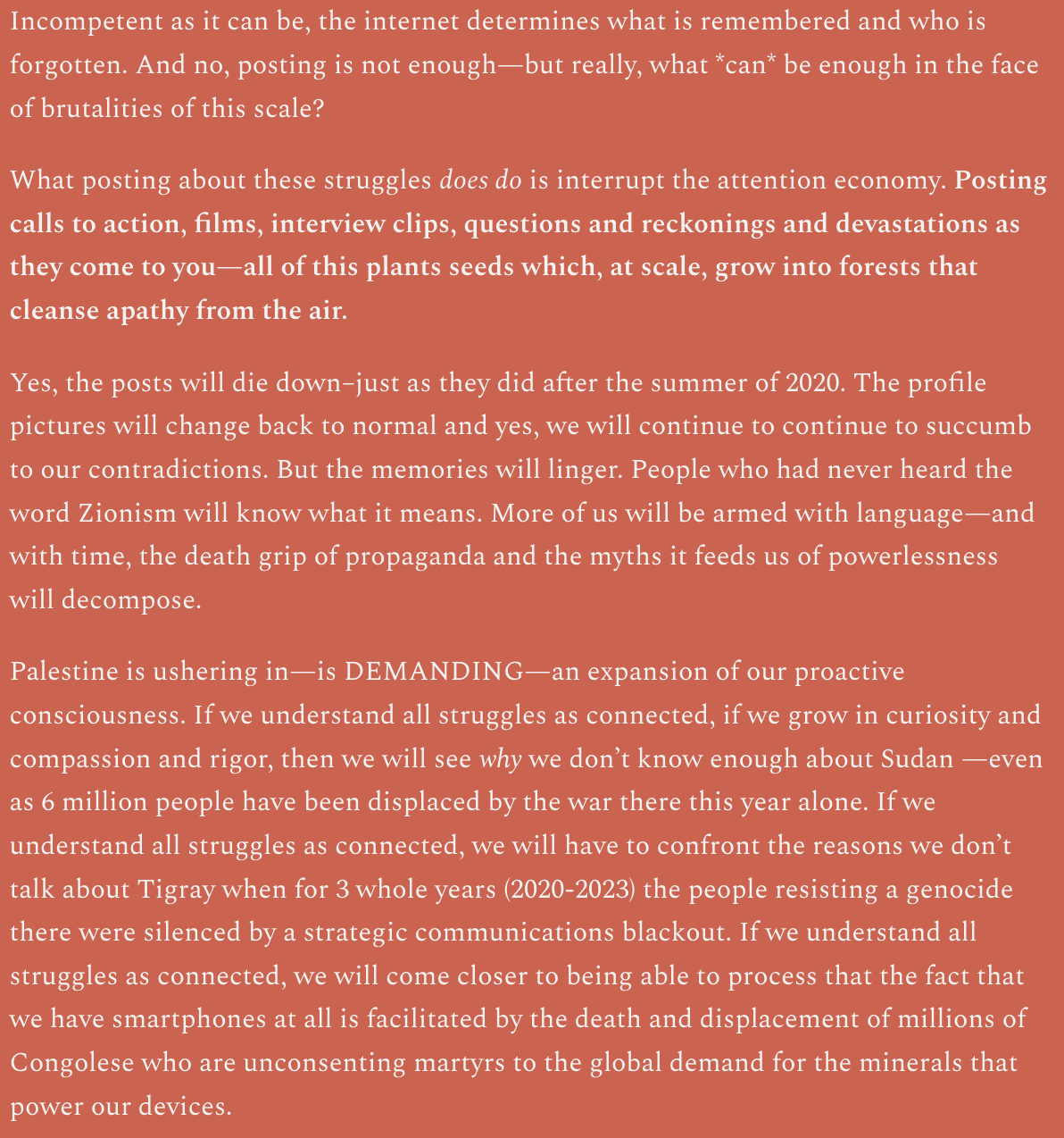 Understanding the Kafala System Micro-Syllabus:https://www.walkfree.org/global-slavery-index/findings/spotlights/life-under-the-kafala-system/ https://armlebanon.org/abolish-kafala/ (Their current fundraising efforts are also essential to boost: https://fundahope.com/en/fundraisers/in-support-of-beiruts-migrant-community-center) https://www.aljazeera.com/opinions/2019/11/14/the-lebanese-revolution-must-abolish-the-kafala-system (14 Nov 2019) https://armlebanon.org/domestic-workers-traded-and-sold-via-twitter-in-arab-countries/ https://ir.library.louisville.edu/cgi/viewcontent.cgi?article=3436&context=etd https://www.levantx.com/bp-source/finding-kin-a-history-of-african-organization-in-the-mena The lack of familiarity around the Indian Ocean/Swahili Seas slave trade is what renders these afterlives to go unchecked in the West. Acknowledging that afterlives of slavery continue to fracture solidarities is not counter-insurgent, it is imperative. Nearly a year ago, I wrote about how Gaza was demanding rigor and capacity from us. Nearly a year later, this continues to ring true in ways that are nothing short of heartbreaking. And heartbreak is demoralizing. It is heartbreaking to witness my African kin left behind when war strikes in Lebanon, the same way they were in Ukraine. It is heartbreaking to feel like speaking out about this, from the comfort of my room in Los Angeles, is itself a betrayal. The root of that betrayal though is this labyrinth of allegiances that many of us find ourselves in. When so much of our solidarity is proclaimed, instead of acted upon, it makes sense that our grief feels insufficient when channeled through words alone. I am sitting here writing and enraged and tomorrow I am meeting a friend for a picnic. I have had to justify inhabiting shame around my contradictions because acting upon them has been made to seem too precarious, too dangerous to commit to. Indeed, many peoples’ profile pictures have returned back ‘to normal’. I myself speak out less than I did 10 months ago. In part because I am ‘jaded’ but largely because I am heartbroken. I’m still based in America, still one crisis away from overdraft notices (still fresh out of a crisis, if I’m being honest), still abundant in community, still cloaked in grief, still adept at compartmentalizing that, still bitter, still burnt out from it all. Still everything and everything still keeps getting crazier. I’ve been intending to share more dispatches trying to market the lecture series I’m doing because I have bills to pay but have been too sick and too embarrassed to do so. Even this post started with the intention of being some sort of ad if I’m being honest. I spoke about the Indian Ocean slave trade at this past weekend’s installation of the Indigenous Tech Open Studio / Lecture series and had planned to share a dispatch on it to promote next week’s session on Radical Love as Technology – not even because I want to but because I needed to. ‘Working’ right now feels silly, as theoretically necessary as it seems. I could write a whole post about that on its own but I’ll spare y’all from that neighborhood of my internal spirals. That being said, the (Indian/Swahili Seas) Oceanic Memory session recording link is available here. It feels very cringeworthy to share the link to get tickets to the whole series after having shared/admitted all of the above but it really would be nourishing to get to share (e)space with folks these upcoming weekends and get to talk about this all together in live time. Thanks for bearing with me through the clumsiness & exasperation. Yours in Radical Love, Neema You're currently a free subscriber to Neema’s Substack. For the full experience, upgrade your subscription. |