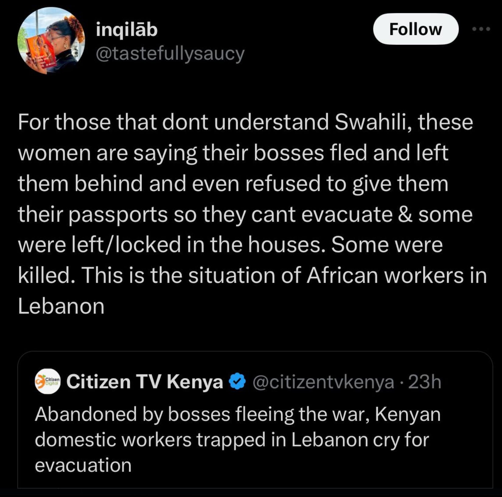 Understanding the Kafala System: Afterlives of the Indian Ocean Slave Trade'Solidarity' is who will be enraged into action on your behalf – even & especially when it is 'inconvenient'.I love all Black people, and especially the ones most betrayed by the intersections they inhabit. The Kenyans working as moderators for Meta in Nairobi and the Kenyans whose passports were taken from them when they got to the Gulf working as domestic laborers. Everyone whose love and necessity has demanded sacrifices unimaginable to 99.9% of the West & whose need for that love to be reciprocated is deemed ‘inconvenient’. A lot of people don’t know that the first documented slave revolt in history took place in the 9th century – as in, over 1000 years ago – in southern Iraq. There were 50,000 East Africans enslaved there at the time, and the East-African-powered Zanj Rebellion whole heartedly restructured the Abbasid empire that it rose up against. Google spreadsheet of Lebanon / marginalized & migrant worker donation links: https://docs.google.com/document/u/0/d/1PigQ6J-PVy-gisrcSh1-TMhD1X2PK2BxJe-ElQyKLm0/mobilebasic