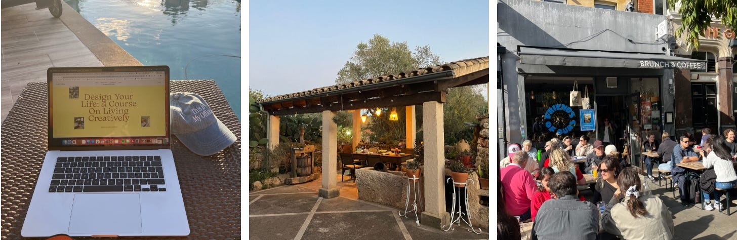 Out of Office provides experiences and tools to reimagine how we live and work in a modern world. We seek to initiate a shift from work-centered to life-centered existence, to help people cultivate engaged, authentic, and vibrant modes of living 🌳🎨 If you’d like to support this mission, get access to our members hub including Creative City Guides, retreats and off-the-grid locations and a directory of OOO-vouched third spaces to co-work & play (+ discounts), become a member 🧡👇 Over the past few days, I’ve savored doing nothing—losing track of time, not opening my laptop, journaling, and reading. As I reflect on the year, I feel so grateful for how I’ve been able to design my life. I can’t wait to see how it evolves in the year ahead. This reflection has energized me to create a recap here—both to celebrate the journey we’ve taken with Out of Office and to look back on my personal journey, highs and lows, this year. I hope this overview gives you a look into what life as the founder of Out of Office looks like :) and inspires you to reimagine what everyday living can look like. With Out of Office, my aim is to champion more creative ways of working and living while providing the tools and resources to support a lifestyle beyond the traditional 9-5 office framework. To break away from the daily routine, and invest in and discover what makes you feel most alive. JanuaryTenerife and La Gomera Jan/FebruaryLondon Days ![]() Barcelona ![]() MarchMarch was definitely the toughest month this year (and prob of my whole life so far). I found out I was pregnant, which brought so much joy, but I had a miscarriage a few weeks later. It broke my heart, and I experienced a depth of pain I had never known before. April/MayWe launched the Out of Office Uniform! MayI flew to Morocco to co-facilitate a workshop and creative scavenger hunt at the House of Beautiful Business conference. We helped attendees stay present during the conference and helped end the 3-day conference with a community-focused experience centered on creativity and collective dreaming. ![]() Later in May, I traveled to LA and NYC. I needed time away from everything that had happened, met friends, soaked up inspiration, and celebrated the launch of our OOO Uniform with the LA and NYC communities. ![]() JuneMy husband and I took a three-week vacation in Japan, where we immersed ourselves in nature, indulged in amazing food, and reflected on what’s next for us—all while embracing a slower pace of life. ![]() SeptemberI spent most of September between Austria and Italy, celebrating that I got pregnant again 💛 (with lots of gelato in Venice!) and hosting our first Out of Office in-person residency in Northern Italy with my co-host, Dana (more residencies coming in 2025, sign up for the waitlist!) ![]() OctoberEnjoyed some sunny days in London, a beautiful week in Mallorca, and launched our online program “A Course on Living Creatively” 🎨 whoop whoop! We’ve got the most magical group, so very grateful for this crew and cant wait to host more next year! ![]() NovemberNovember brought me back to NYC for two weeks of soaking up Fall energy 🍁 I worked from cafés, explored markets and my fav Brooklyn streets, and had inspiring conversations with some of my favorite people 🫂 ![]() DecemberMy husband and I spent the first half of December in Italy with his family, where I cherished my growing belly and enjoyed a mini babymoon at a stunning spa in the Tuscan hills 🌿 ![]() As we’re starting into a new year, I want to say THANK YOU to all of you. Your support and you following this newsletter and platform means the world to me and show me how much it is needed to showcase more diverse, unconventional, creative and fulfilling ways of working and living. If you want to join me in celebrating how far we’ve come, look back at the year, and dream about how to set up a more vibrant and fulfilling creative life in the coming year, you can join our workshop on January 8th. You’ll receive a beautifully designed workbook to reflect on the past year ahead of time, and in our online session, we’ll dream up what intention we want to bring into the new year, together ✨ You’re currently a free subscriber to Out Of Office Network. If you have been enjoying this newsletter and want to support this mission, join the network! You’ll get discounts to partner brands, free access to city guides and our directory for OOO spaces and much more 🧡👇 Looking for some inspiration for your work-life? |