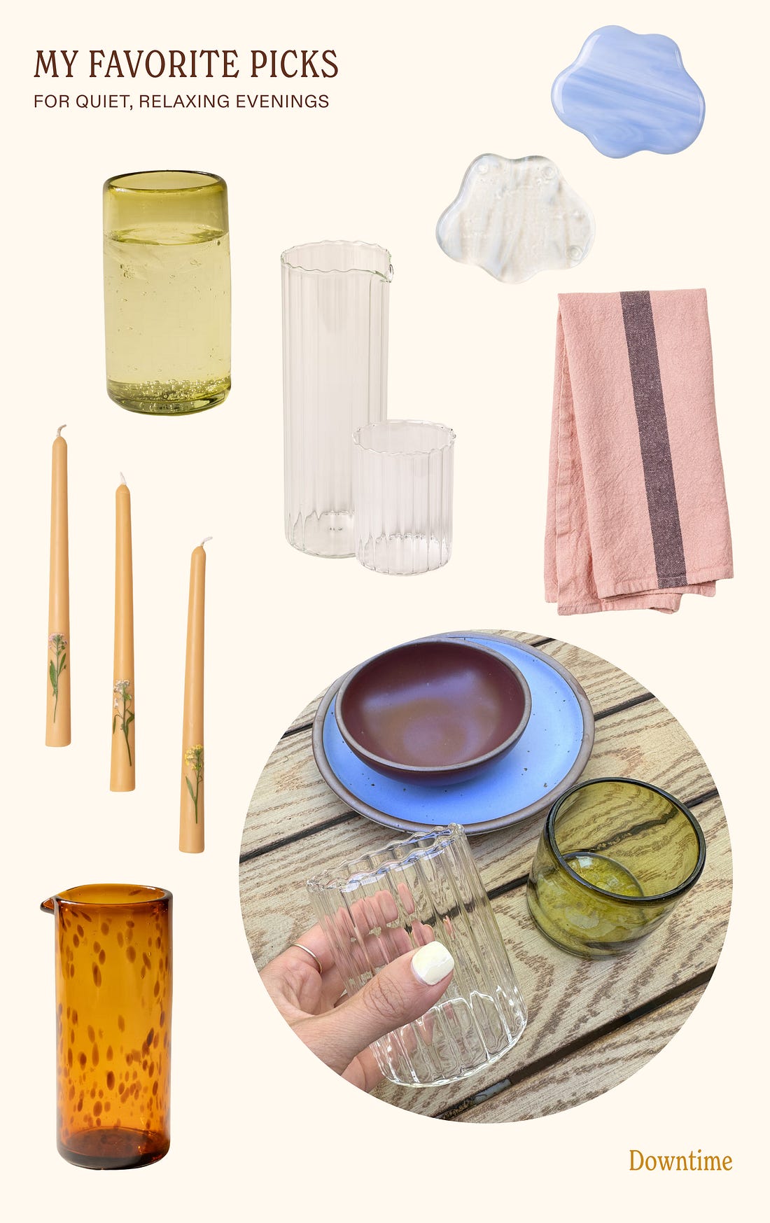 A spring giveaway! I’m partnering with East Fork to give away a few of my favorite forms—the ones I grab on repeat for slow mornings, cozy dinners, and all the meals in between—to a reader of Downtime. One lucky Downtime subscriber will receive an East Fork Starter Set (which includes 4 Dinner Plates, 4 Side Plates and 4 Everyday Bowls) and The Mug 4-Pack in a color of your choosing. Be sure you’re subscribed to this newsletter first, then click the button below to enter the giveaway—good luck! May your spring evenings be ever romanticized, Alisha More pretty upgrades for your everyday thingsIt’s worth taking a second look at the objects you use and see every day—and consider giving them an elevated refresh. The result is micro-moments of joy, the good feeling that you’re using something special, whether that’s a lovely hand soap or a thoughtfully designed kitchen tool. ![]() FOR THE KITCHEN