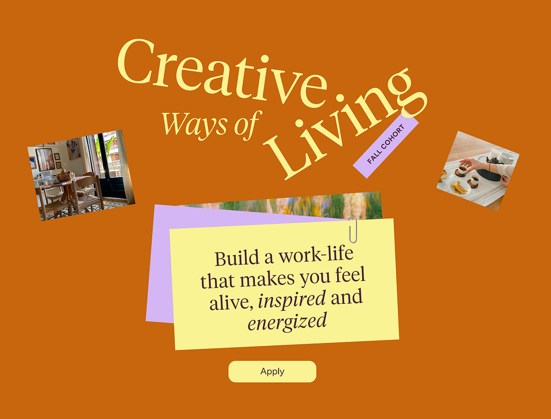 Hello & welcome to the Out of Office—your inspiration and guide for a life that feels more alive, inspiring & creative. 🌳🎨 For those who are new here, I’m so excited you found our little corner of the internet. To access our full content, including creative travel guides, tools and Field Trips Platform — with curated places to work, play and connect — become a paid member 🧡 This summer might have given you a taste of what a full, vibrant life can feel like. It might have been a slow morning, a nice walk along a beach, an ice cream work-break with a friend, listening to the birds, a visit to the local farmers market with all its abundance of ripe tomatoes, figs, or peaches, depending on where in the world you are. But then, it’s so so easy to fall back into business-as-usual. Many aspects of our work culture — such as the stigmas of a CV gap, taking vacation for more than one week, reducing hours to less than full-time, treating work as just work rather than the entirety of life, or yes, even taking an ice-cream break in the middle of the day — make it unreasonably difficult to engage in healthier ways of working and living. Everything we read online, every app we use for sharing what we love or building our business on, every career path we hear about carry the same message: grow bigger, earn more, and chase the next promotion. It’s easy to get pulled into this way of thinking — I still do, again and again. When I worked as a contractor for a tech company in the US a couple of years ago, they offered me a full-time job. On one hand, I felt really humbled and tempted thinking, “Maybe I should take it. To feel „legit“ as someone who works at xx. For the title. For the benefits. For the good, stable money.“ And sometimes, that can be a great option. But then I remembered what I really wanted. I didn’t want to spend my energy on office politics or on paving the way for promotions. I didn’t want to grow into managing a team. I wanted the flexibility to travel and work from different countries. I wanted slow summers in Europe. I wanted to collaborate with inspiring people in my orbit without sneaking around a 9–5. I wanted to be able to drop into a yoga class at 10:30 am on a Thursday, afterwards grab breakfast with a friend, or go to the farmers’ market in the middle of the week. And make a good income that can sustain my lifestyle and build my dreams. So it wasn’t aligned with my values and what I wanted in my lift. When I look at that list, what I really value becomes clear: → Flexibility & freedom → A zest for life — pursuing what makes me feel alive, whether through my work, collaborations, or creations → Collaboration & creative freedom — the space to follow my curiosity and work with people who spark my interest → Financial stability — enough to live my lifestyle, and able to invest in the projects, ideas, and dreams that excite me (whether that’s my own business, a friend’s business, a future home etc.) This is part of what we’re talking about in our upcoming Creative Ways of Living Cohort (CWOL), starting on Oct 15th. We find the things within you that make you feel alive, and redefine what success means to you. We expand our imagination to different paths of living and working. To create a way of living and working that feels energizing and inspiring. Where work doesn’t take over your life. But make space for different areas of your life. A life where you’re not rushing through the week, and only waiting for the weekend to arrive. If you often think about what you could do, but never do it, this is the place for you to lean into a new way of living. As Oliver Burkeman wrote, „To take action is to risk that it might fail, or that it might succeed; that it might lead to big changes or no changes at all. Not taking action is the more comfortable alternative to the more uncomfortable intensity of actually living.” With this cohort, we’ll help you jump out of your comfort zone, and over the fence. And into actually living. I hope you’ll join us ✨ Alice Alice Katter is a Creative Work Culture Consultant and Founder of Out of Office. Originally from Austria, she has lived in Vienna, London, and NYC. And in between, has spent months investigating work and life in Mexico, California, Cape Town, Italy, and Barcelona, to name a few. To access more interviews like this, creative travel guides, resources, and curated locations to work, play and connect, upgrade to our paid plan 🧡 |