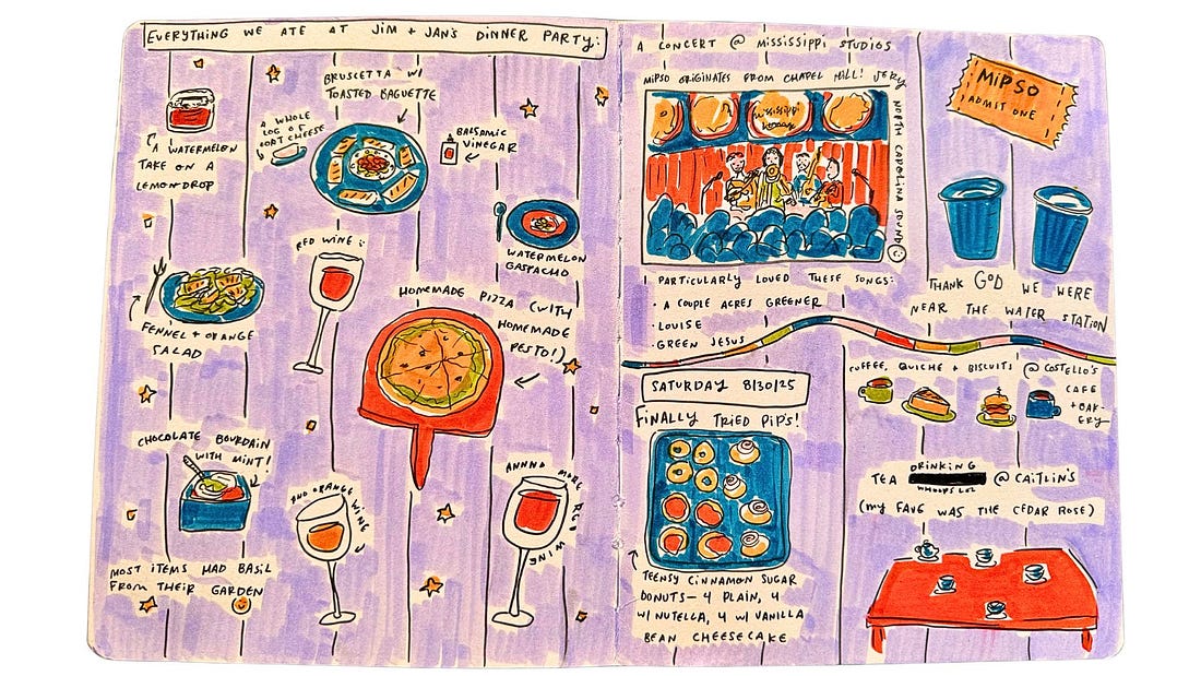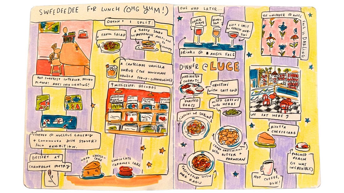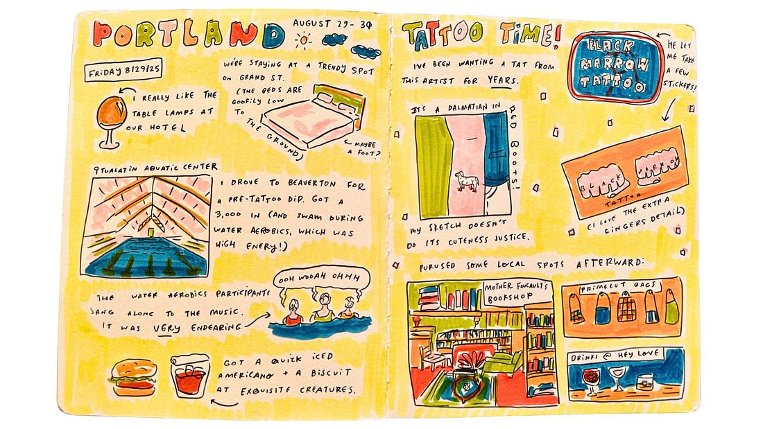 Haley Wrote This is a reader-supported newsletter. If it has brightened your inbox, please consider supporting it by becoming a paid subscriber (you’ll get to read the entirety of this email and so much more!) Last weekend, my husband and I drove the three hours down from Seattle to Portland. The occasion? My tattoo appointment with Jaime, the incredible talent behind Black Marrow Tattoo. The itinerary otherwise? Unplanned. We ended up cobbling together a sweet adventure (with some expected pitfalls—think parking troubles and humidity and a sandwich spot that gave us both tummy aches). But the highs were high, and you better believe I documented them in my sketchbook! Note: If the pages are hard to read, I recommend reading this post directly on Substack (you can click on the photos below as a shortcut to the website) or in the app (you can zoom to your heart’s desire!).