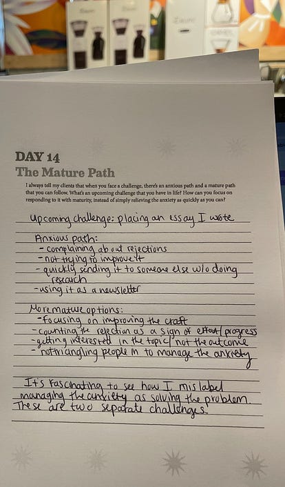 My book Everything Isn’t Terrible will be turning 6 (!) at the end of the year, which is hard to believe. I still laugh at the madness of such a title released three months before the pandemic, but people bought it, and they still keep buying it, and they’re still asking to translate it into other languages. I created a 30-Day anxiety journal as a pre-order bonus for the book, to help people pay attention to their relationship patterns. Think of it as a field journal for noting what we do with ourselves when we get all stirred up. Many of you may already have it, but I wanted to provide it as a resource to all subscribers since we’re in some anxious times, and this is something tangible I can put into the world. So here’s the download link.