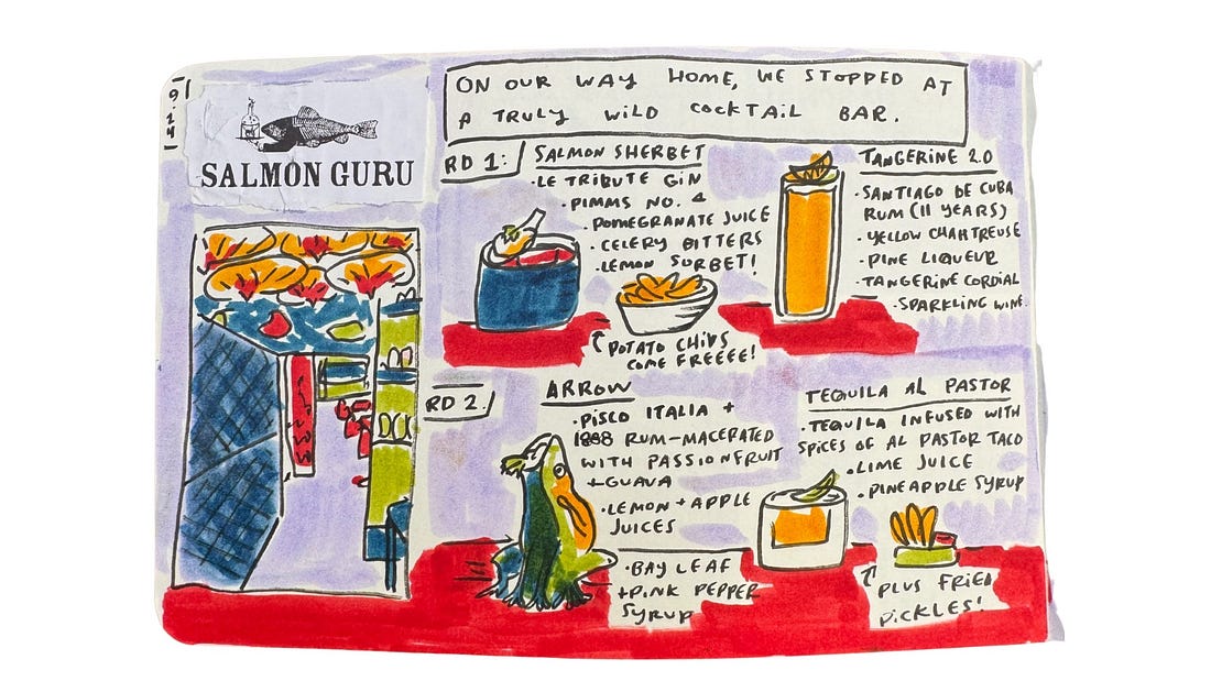 Salmon Guru: This came recommended by so many people when I asked for must-go places on Instagram. The interior of this bar alone makes it worth visiting—a shag carpet column, colorful backlighting, neon signs, and a ceiling completely decked out in parasols. Fortunately, the drinks are innovative and delicious, too. I got one that came with a scoop of lemon sorbet, so.