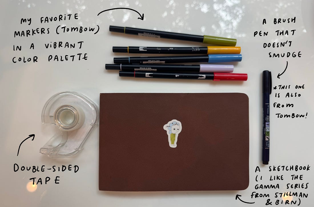 Optional: Dress up the sketchbook cover! I usually pick a single sticker from one of my favorite artists, Sara Hagale.