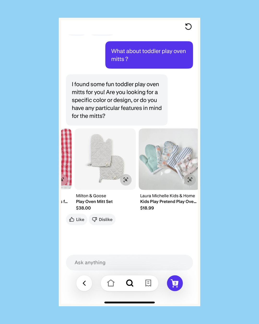 The Shop app also features a convenient chat function that can help you find specific items and discover new brands. I love this play oven mitt set from Milton & Goose!