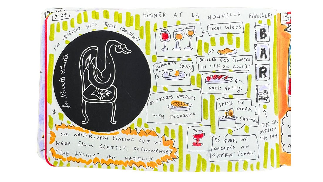 La Nouvelle Famille: Perhaps my favorite find on the entire island! The restaurant itself occupies the side of a stone alleyway and has the best logo I’ve seen in a while (scroll up to see the coaster I taped in my sketchbook). From there, it only got better: Local wines, buttery noodles with pecorino, burrata, a spicy ice cream sandwich so delicious we ordered an additional scoop of vanilla.