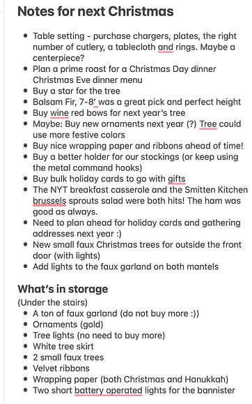 That’s the gist of it. Simple but effective! I’ve found that building this type of list-making habit is very much that—a habit, a muscle that you have to develop, but once you get going, you’ll find yourself whipping out your phone, hastily jotting down all your fun notes about your friends and family after a hang. Your future self will thank you when November hits, and you’ve got a treasure trove of gift ideas—and a tidy budgeting spreadsheet where you can input your final gifting picks. 3. Give your future self the gift of an annual Notes app brain dump ritualI use my Notes app as a space for my giant post-holiday brain dump (among all my other brain dumps, of course). It’s one of the single most genius (if I do say so myself) I’ve ever done for my future, holiday-harebrained-self. Every December 26th or so, I open a new note and title it “Notes for next Christmas.” It’s where I track things like: