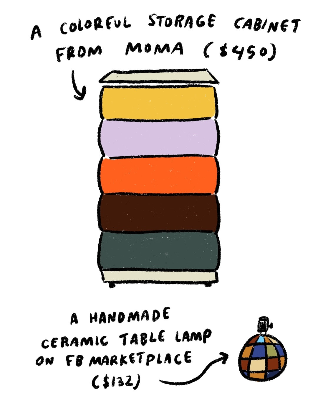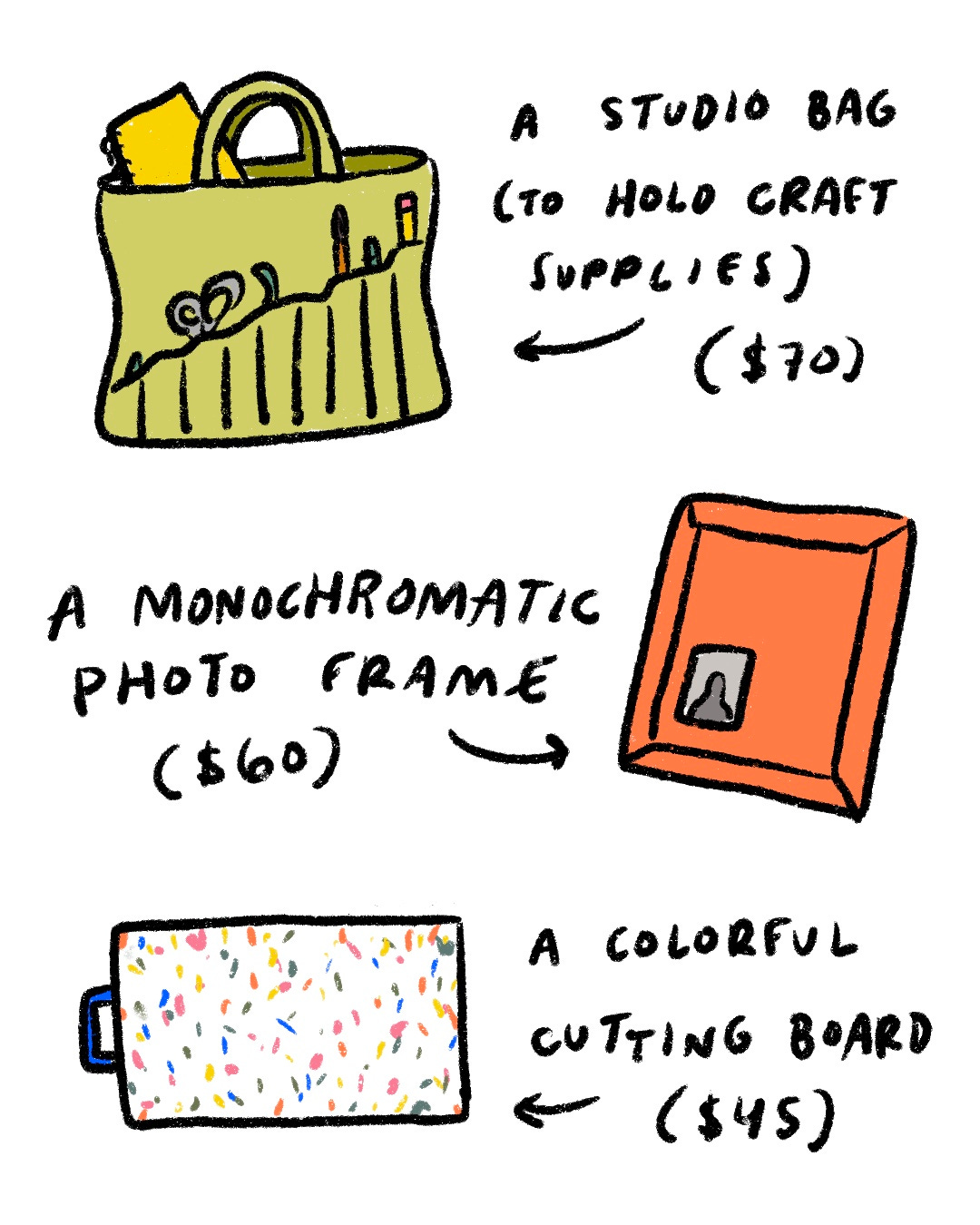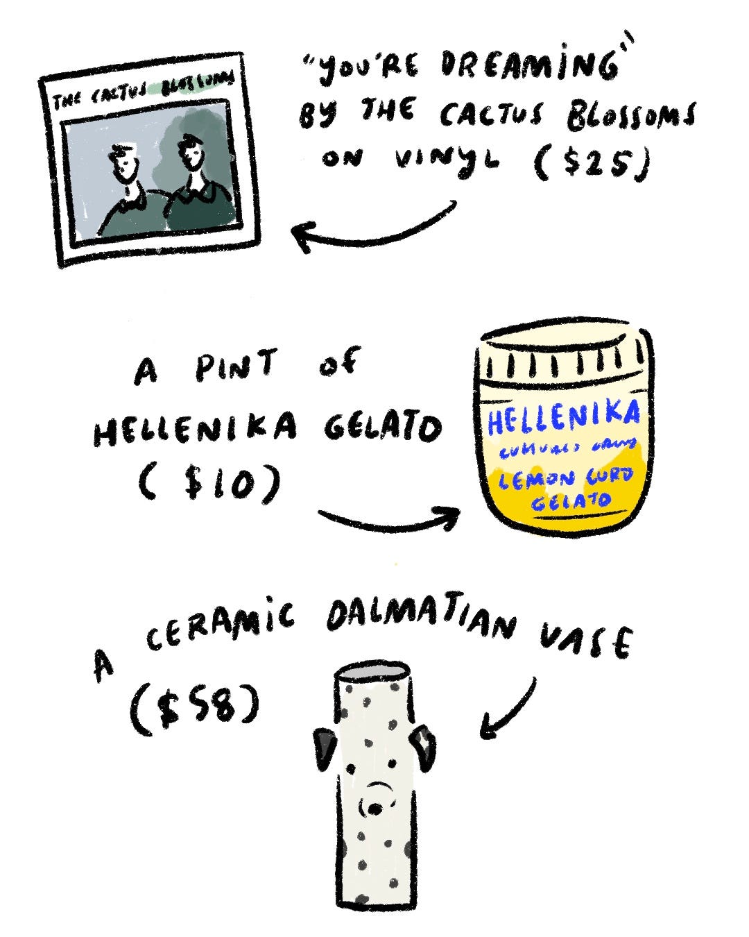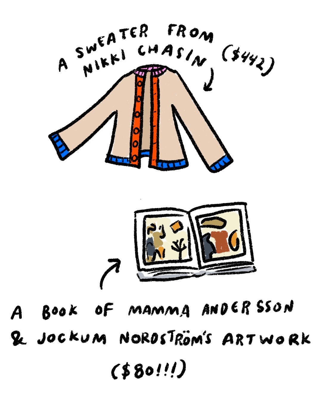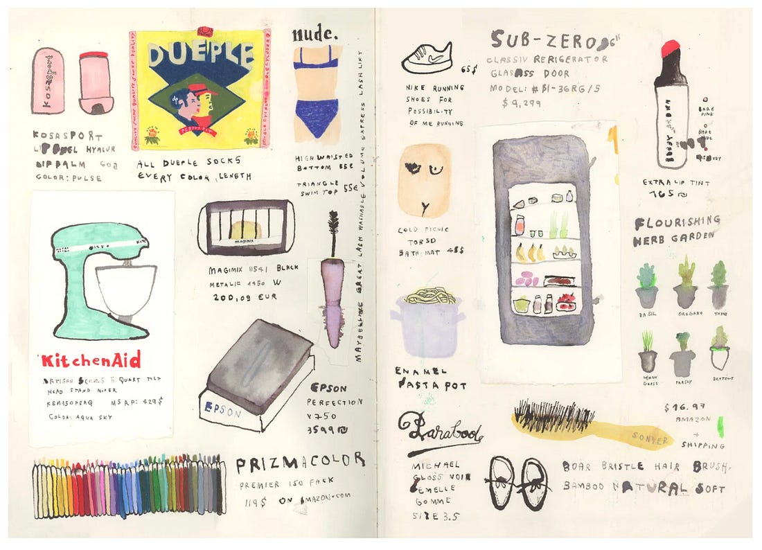 Welcome to another illustrated edition of Haley Wrote This! You can support this newsletter by clicking the ♡ button at the bottom and sharing this publication with your friends. Paid subscriptions keep it alive entirely. Thank you! One of my favorite art projects of all time is illustrator Noa Goffer’s The Wishlist. The concept is simple: Whenever Goffer coveted a material item (be it a lilac pasta pot or a Dyson vacuum or even cushioned insoles), she didn’t add it to her shopping cart. Instead, she drew it.