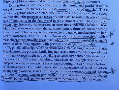 Thanks for that. As you’ll soon find in my end notes, dozens upon dozens of books went into this process of understanding my mom’s past and the bigger picture of my family’s story. Here, I’ll share just a handful that rearranged my brain and proved most essential. Silvia Federici’s Witches, Witch-Hunting, and WomenI mean, just read everything Federici has ever written, OK? And be sure to include Patriarchy of the Wage, which also makes an appearance in my book. That’s the one where she argues that the punishment of sex workers was essential to convincing women to accept unpaid work within the family home. I ended up referencing Witches, Witch-Hunting, and Women a bunch—including around how many of the women accused during the witch hunts were unmarried mothers or “promiscuous” women. A choice quote from Federici: “Once exorcised, denied its subversive potential through the witch hunt, female sexuality could be recuperated in a matrimonial context and for procreative ends.” This is exactly what happened at these maternity homes. Unwed mothers were hidden away during their pregnancies, separated from their babies through coerced adoptions, and then redirected to marriage. Their sexuality was “recuperated” within the nuclear family. bell hooks’ Ain’t I a WomanThe vast majority of women sent to pre-Roe homes for unwed mothers were white. That’s because of racist stereotypes about Black women’s hypersexuality, which ruled out the possibility of “redemption.” I found Ain’t I a Woman to be essential to my own understanding of the historical context of the portrayal of white women as pure and innocent, alongside the demonization of Black women’s sexuality. Homes for unwed mothers were build upon these racist ideas of “good” and “bad” women. As Patricia Hill Collins puts it in Black Feminist Thought, another must-read book, the image of the jezebel made “pure White womanhood possible.” This is another case where I have to say: read everything else that bell hooks has written, too. Gail Pheterson’s The Prostitution PrismGood luck finding a physical copy of this one! It’s a crime that this book isn’t more readily available (this used copy is available for $148). I read it on the Internet Archive, an organization that I personally thanked in my acknowledgements because it made so many out-of-print books available to me. The sex-worker activist Gail Pheterson’s writing has been so meaningful to me over the years, but I love this book in particular for its explanation of the concept of “whore stigma,” which applies not only to sex workers but to anyone who steps outside the bounds of appropriate femininity. Just like Federici argued—along with the sex-worker activist Margo St. James—the punishment of sex workers is a way to keep all women in line. Elaine Showalter’s The Female MaladyThere’s a whole chapter in my memoir that dives into discussions of women and madness, for reasons you’ll have to discover in the book itself. Suffice it to say: I talk a lot about restrictive ideas around women’s desire and sexuality, especially as they collide with motherhood. Elaine Showalter’s The Female Malady shows that feminine ideals have shaped ideas around women’s mental illness across history—and she notes that “uncontrolled sexuality seemed the major, almost defining symptom of insanity in women.” Jill Nagle’s Whores and Others FeministsThe anthology Whores and Others Feminists, edited by Jill Nagle, is one that I’ve returned to again and again for over 15 years. There are essays by legends like Nina Hartley, Annie Sprinkle, and Carol Queen. Nagle’s introduction alone is worth the price of admission. She talks about the concept of “compulsory virtue,” a take off Adrienne Rich’s theory of “compulsory heterosexuality.” This connects to Pheterson’s theory of “whore stigma,” which acts upon all of us. It is a controlling threat. Rickie Solinger’s Wake Up Little SusieWhen I reached out to Rickie Solinger during the fact-checking process for my book, I was starstruck. Her work as a historian focusing on issues of reproductive justice has been essential and groundbreaking. Wake Up Little Susie gave me an entirely new lens on the pre-Roe era of adoption and homes for unwed mothers. She helped me to see these homes as part of a racist and sexist system that was pushing white unwed mothers toward adoption and then re-routing them into the nuclear family home. Meanwhile, Black single mothers were expected to raise their own children—and, as a result, they faced a slew of associated consequences. Here’s a little photo that is representative of my entire copy of the book—it’s all underlines and squiggles and stars. It’s just two-and-a-half weeks until my book comes out. If you buy a copy now, it’ll help set this book up for success. Pre-orders are a powerful signal to libraries, bookstores, and publishers. I really can’t emphasize that enough. They help determine a book’s trajectory very early on. It would mean the world to me if you pre-ordered a copy now.It’s gotten starred reviews from Kirkus (”deeply researched, lyrically written,” “trenchant,” “moving,” and “a powerful rejection of white-male dominated systems of oppression”) and Booklist (”a stirring family history... reckoning with race, power, privilege, and women’s roles”).A pre-order means you get it on or before pub day.