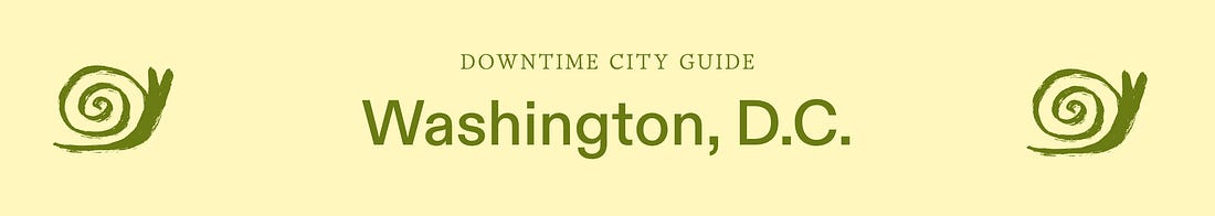 Kramers: “Kramers, the bookstore, holds a special place in my heart. They have a great selection for adults and kids, plus a cafe with comfort food.” — Bsrat Mezghebe Sankofa: “Sankofa is a D.C. institution for Afrocentric books, lectures, and film screenings founded by the legendary filmmaking couple, Haile Gerima and Shirikiana Aina.” — Bsrat Mezghebe Wonderland Books: “I was ecstatic when our neighborhood finally got an indie bookstore of its own last year. The owners do a wonderful job in programming author talks, and the children’s section is small but mighty. A favorite place for us to browse for books and gifts.” — Alisha Ramos, creator of Downtime [sneaking in a last minute rec!] Bold Fork Books: “I think I did all of my Christmas shopping at this cookbook store in Mount Pleasant — all of my cooks got a cookbook for the holidays. Everyone who works there is so nice, and they have such good events.” — Alicia Wang Secondi: “For clothes, I never get more compliments than on the few designer pieces I have scooped up for nothing at Secondi, a consignment store in Dupont Circle.” — Lily Meyer Mercedes Bien: “If you stumble upon a building in Adams Morgan with a cast iron balcony that looks transplanted from New Orleans, you’ve found the chic vintage purveyor Mercedes Bien. The owner has great taste in both men’s and womenswear and a wealth of knowledge about fabric and fit that she’s more than happy to share.” — Annie Yi Manse: “A beautifully curated Georgetown shop filled with antiques, objects, and pieces that feel timeless rather than trendy. It’s often where I pop in to pick up a gift for a friend or to get some last minute pieces to accessorize our clients’ homes.” — Melissa Colgan Hidden gemsNational Arboretum: “People don’t talk enough about the Arboretum! It’s huge, and there’s a Bonsai exhibit inside. It’s my dogs’ happy place, so it’s mine, too.” — Alicia Wang Kenilworth Aquatic Gardens: “Walking through floating flowers on a snaky wooden boardwalk? Magical.” — Lily Meyer Tregaron Conservancy: “A forest sanctuary within the city (it’s also where my husband Nik proposed to me!). Grab a breakfast sandwich from Cracked Eggery in Cleveland Park, then walk down Macomb and enjoy the wooded trails and lily pond.” — Annie Yi The Peacock Room at the National Museum of Asian Art: “Created by the painter James McNeill Whistler, this enveloping work of interior design-slash-art was originally a dining room in London. It’s gorgeous, with blue-green walls and gold leaf paintings. It was also the subject of a big fight between Whistler and his patron, Frederick Leyland.” — Eliza Brooke Martin Luther King Jr. Memorial Library: “It went through a recent, stunning renovation. The rooftop has amazing views. There’s a fun indoor slide that’s just for kids, but you might be able to sneak down it (I did).” — Bsrat Mezghebe Enjoy D.C., and drop your own local recommendations in the comments section! You’re currently a free subscriber to Downtime. If you love what you read and discover here, consider upgrading to paid for the full experience and get access to exclusive subscriber-only content. THANK YOU!