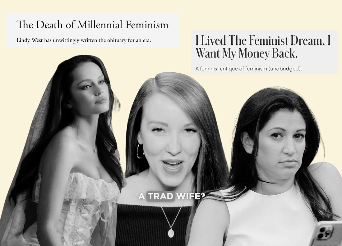 It’s not just the manosphere, MAGA, TERFs, or reactionary feminists who are hating on “2010s feminism” right now. Increasingly, liberals and centrists are getting in on the action. This growing feminist backlash claims that feminism has gone too far. That women have been made unhappy by progressive propaganda. That they’re being strong-armed into polyamory, casual sex, education, careerism, single-motherhood, and childlessness. Meanwhile, as we discussed in a past episode, the Heritage Foundation is trying to use laws and public policy to strong-arm women into marriage, motherhood, and dependence on men. But never mind all that! The real threat, some say, is that feminists wrote some snarky blog posts in the 2010s. Don’t worry, this episode does not rehash the Adult Braces discourse, but we do discuss how the Lindy West pile-on is part of a broader feminist backlash that has been brewing for many years—one that folks across the political spectrum are branding as a reasonable and empowering middle-ground for women. The discourse is truly a mess out there, folks, but in this episode, we help you see the feminist forest for the trees. And while we’ve previously avoided confronting some of the more troubling arguments we’ve seen among liberal feminists—including, notably, on Substack—well, we’re over that. Behind the paywall, you’ll get our most candid thoughts on everything people are saying about feminism today. This is a paid episode. Free subscribers get a generous preview, but if you want the full, uncensored conversation, you will have to upgrade to knock down the paywall. Paid subscribers make this podcast possible. If you care about the state of feminism, invest in our feminist podcast. Subscribe to Dire Straights to unlock the rest.Become a paying subscriber of Dire Straights to get access to this post and other subscriber-only content. A subscription gets you: